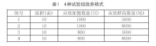(4)放養(yǎng)模式:至3月12日長江1號扣蟹全部放齊,5月20日南美白對蝦苗放齊。設置4種不同放養(yǎng)密度進行試驗研究,詳見表1。