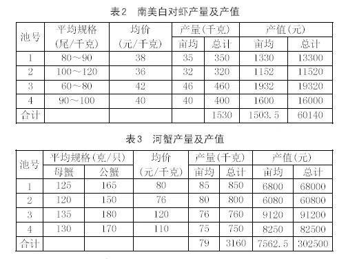 (2)產(chǎn)值:四個塘口南美白對蝦和河蟹的總產(chǎn)值362640元。